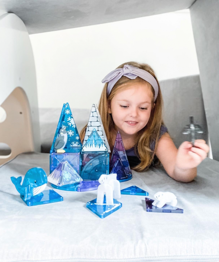 What’s Included: 25 magnetic pieces, including 5 arctic figurines (seal, polar bear, baby polar bear,penguin and whale), 8 squares, 8 triangles (4 isosceles, 4 equilateral), 4 quarter circles What makes it unique: Includes five arctic animal friends (Whale, Penguin, Seal, Polar Bear and Baby Polar Bear) to encourage imaginative play. Features tundra-themed tiles with ice and footprint details to help bring new ideas to life.
