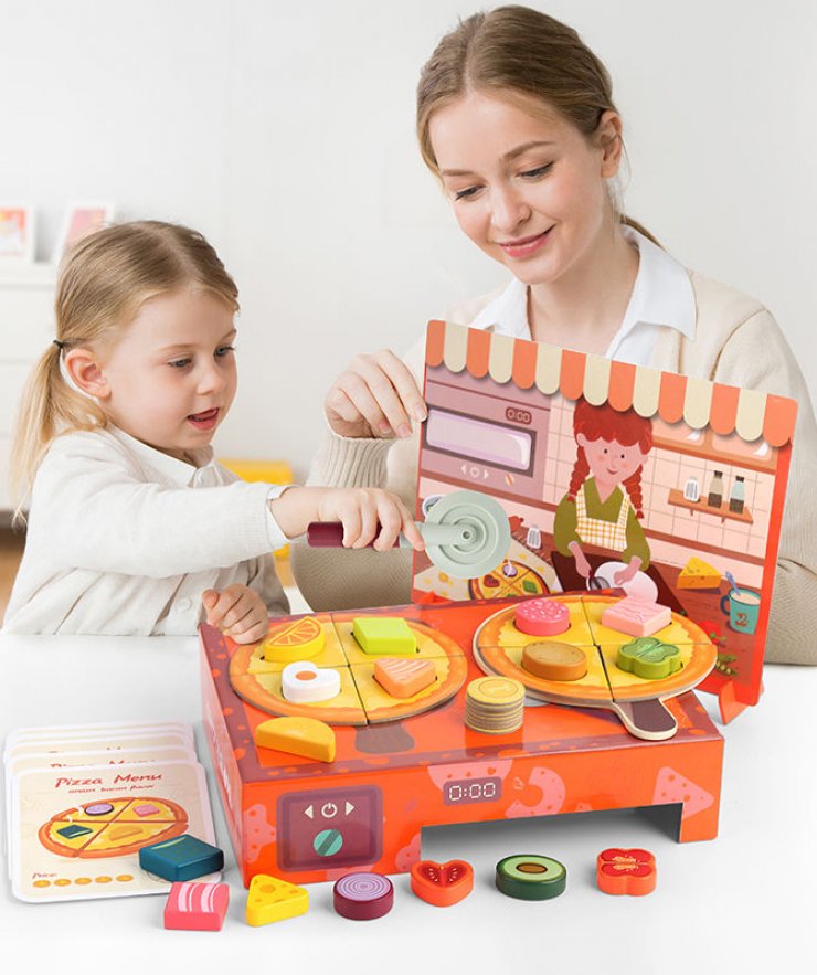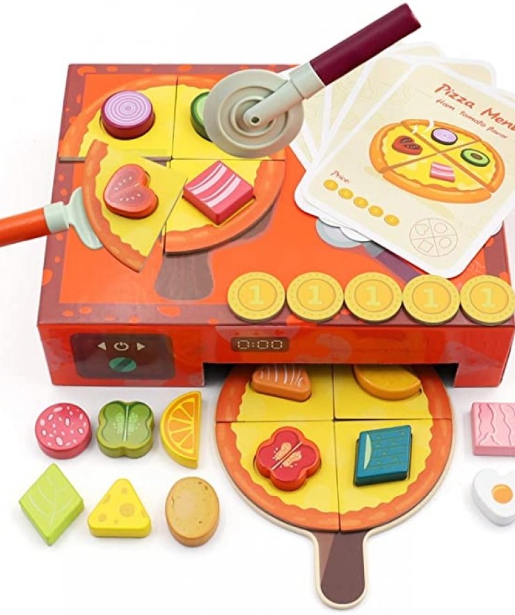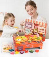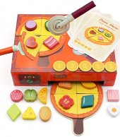 Includes colorful pieces with numbers and shapes that are placed on wooden cakes.